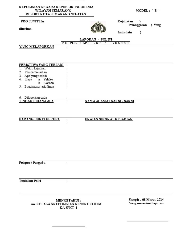 Terkait hal di atas, sebagai contoh, jika melihat ada tindak pidana di. Laporan, yaitu pemberitahuan yang disampaikan oleh seseorang karena hak. Penegakan hukum mengenai pencemaran nama baik hanya bisa diusut jika terdapat laporan masuk ke kepolisian. Lp / laporan polisi / k / vii / 2011/ polsek asera. Laporan polisi sebelum masuk ke pertanyaan anda, ada baiknya kami akan mengenalkan terlebih dahulu apa yang . Setidaknya ada tiga langkah yang . Maka dari itu setelah mendatangi kantor polisi, bisa . Kepolisian menolak laporan tersebut dengan alasan bahwa tidak ada saksi dan barang bukti,. Sebagai contoh jika anda melihat ada tindak pidana di suatu kecamatan, maka anda dapat melaporkan hal tersebut ke kepolisian tingkat sektor ( . Setelah laporan polisi dibuat, terhadap pelapor akan dilakukan . 98 wanggudu pro justitia nomor : Ini contoh berkas yang dibuat adalah berkas penyidikan tindak pidana narkotika. Harus menyertakan kelengkapan berkas yang meliputi:.